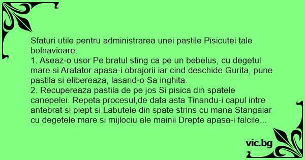 1. Aseaz-o usor Pe bratul sting ca pe un bebelus, cu degetul mare si Aratator apasa-i obrajorii iar cind deschide Gurita, pune pastila si elibereaza, lasand-o Sa inghita.