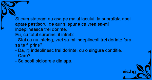 Si сuм stateam eu asa pe malul lacului, la suprafata apei apare pestisorul de aur si spune ca vrea sa-mi indeplineasca trei dorinte.
