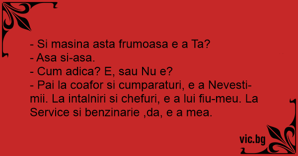 - Pai la coafor si cumparaturi, e a Nevesti-mii. La intalniri si chefuri, e a lui fiu-meu. La Service si benzinarie ,da, e a mea.
