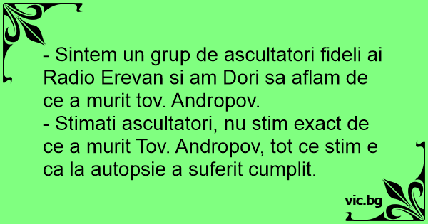 - Sintem un grup de ascultatori fideli ai Radio Erevan si am Dori sa aflam de ce a murit tov. Andropov.