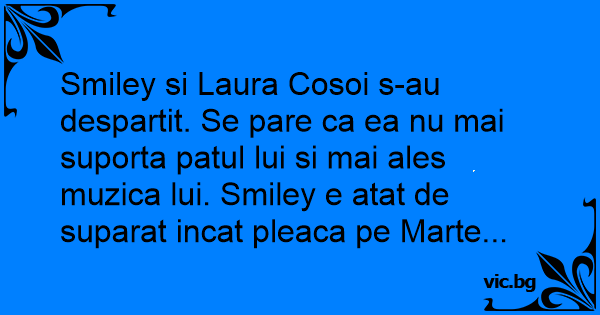 Smiley si Laura Cosoi s-au despartit. Se pare ca ea nu mai suporta patul lui si mai ales muzica lui. Smiley e atat de suparat incat pleaca pe Marte...