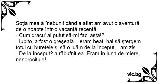 - Iubito, a fost o greşeală... eram beat, hai să ştergem totul cu buretele şi să o luăm de la început, i-am zis.