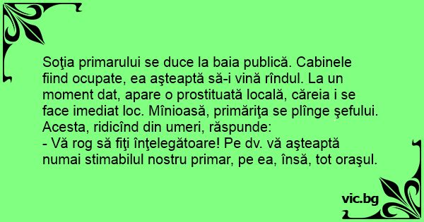 Soţia primarului se duce la baia publică. Cabinele fiind ocupate, ea aşteaptă să-i vină rîndul. La un moment dat, apare o prostituată locală, căreia i se face imediat loc. Mînioasă, primăriţa se plînge şefului. Acesta, ridicînd din umeri, răspunde: