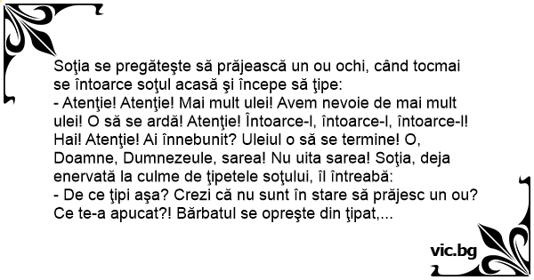 - De ce ţipi aşa? Crezi că nu sunt în stare să prăjesc un ou? Ce te-a apucat?! Bărbatul se opreşte din ţipat, o priveşte în ochi şi îi răspunde foarte calm: