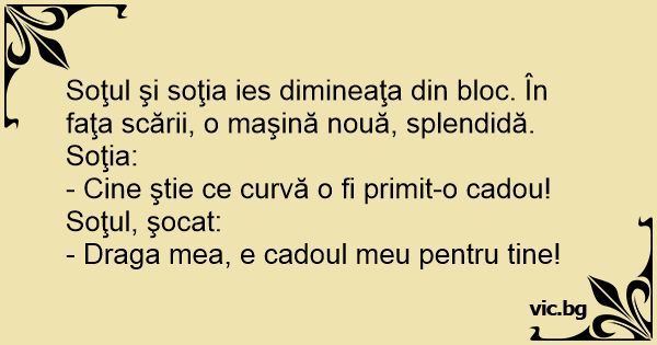 Soţul şi soţia ies dimineaţa din bloc. În faţa scării, o maşină nouă, splendidă. Soţia:
