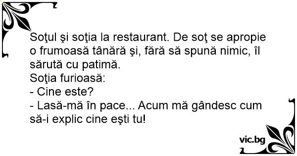 Soţul şi soţia la restaurant. De soţ se apropie o frumoasă tânără şi, fără să spună nimic, îl sărută cu patimă.