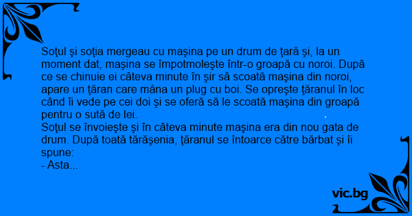 Soţul se învoieşte şi în câteva minute maşina era din nou gata de drum. După toată tărăşenia, ţăranul se întoarce către bărbat şi îi spune: