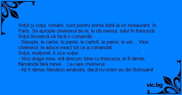 Soţul şi soţia, români, sunt pentru prima dată la un restaurant, în Paris. Se apropie chelnerul de ei, le dă meniul, totul în franceză.