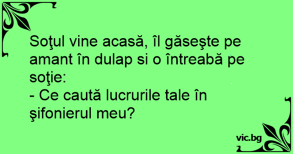 Soţul vine acasă, îl găseşte pe amant în dulap si o întreabă pe soţie: