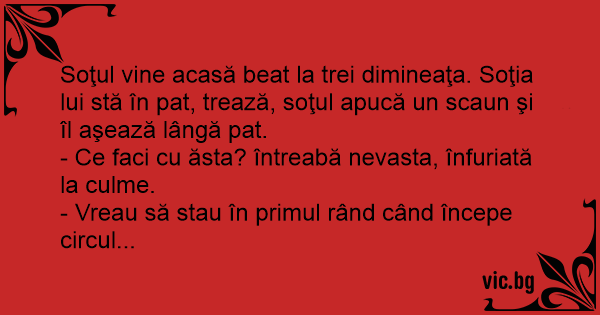Soţul vine acasă beat la trei dimineaţa. Soţia lui stă în pat, trează, soţul apucă un scaun şi îl aşează lângă pat.