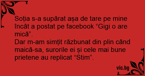 Soția s-a supărat așa de tare pe mine încât a postat pe facebook “Gigi o are mică”.