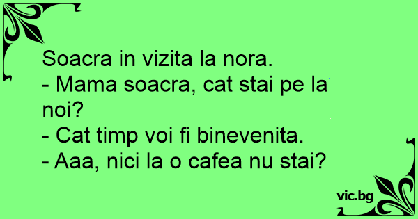Mama soacra, cat stai pe la noi? - Cat sunt primita cu drag, fiule... - Ce pacat! Nici macar la o cafea nu stai?