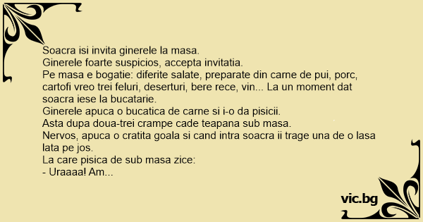 Nervos, apuca o cratita goala si cand intra soacra ii trage una de o lasa lata pe jos.