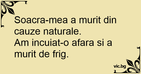 Soacra-mea a murit din cauze naturale.Am incuiat-o afara si a murit de frig. 62 0 0 Bancuri cu soacre Umor negru