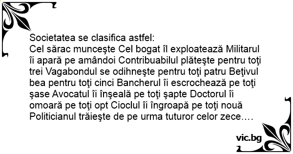 Cel sărac munceşte Cel bogat îl exploatează Militarul îi apară pe amândoi Contribuabilul plăteşte pentru toţi trei Vagabondul se odihneşte pentru toţi patru Beţivul bea pentru toţi cinci Bancherul îi escrochează pe toţi şase Avocatul îi înşeală pe toţi şapte Doctorul îi omoară pe toţi opt Cioclul îi îngroapă pe toţi nouă Politicianul trăieşte de pe urma tuturor celor zece….