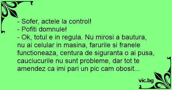 - Ok, totul e in regula. Nu mirosi a bautura, nu ai celular in masina, farurile si franele functioneaza, centura de siguranta o ai pusa, cauciucurile nu sunt probleme, dar tot te amendez ca imi pari un pic cam obosit...