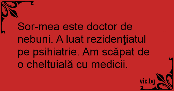 Sor-mea este doctor de nebuni. A luat rezidenţiatul pe psihiatrie. Am scăpat de o cheltuială cu medicii.