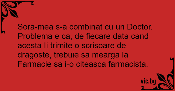 Sora-mea s-a combinat cu un Doctor. Problema e ca, de fiecare data cand acesta Ii trimite o scrisoare de dragoste, trebuie sa mearga la Farmacie sa i-o citeasca farmacista.