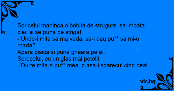 - Du-te mita-n pu** mea, c-asa-i soarecul cind bea!