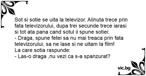 Sot si sotie se uita la televizor. Alinuta trece prin fata televizorului, dupa trei secunde trece iarasi si tot ata pana cand sotul ii spune sotiei: