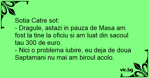 - Dragule, astazi in pauza de Masa am fost la tine la oficiu si am luat din sacoul tau 300 de euro.