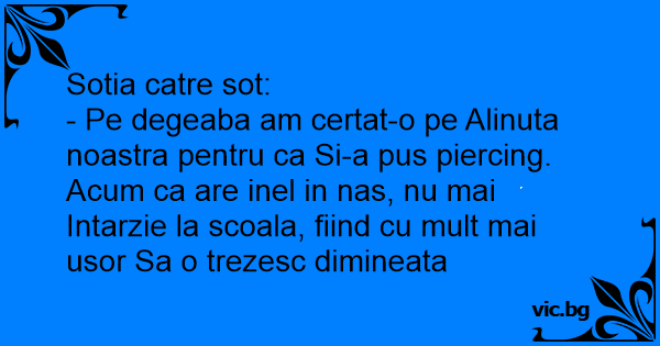 - Pe degeaba am certat-o pe Alinuta noastra pentru ca Si-a pus piercing. Acum ca are inel in nas, nu mai Intarzie la scoala, fiind cu mult mai usor Sa o trezesc dimineata
