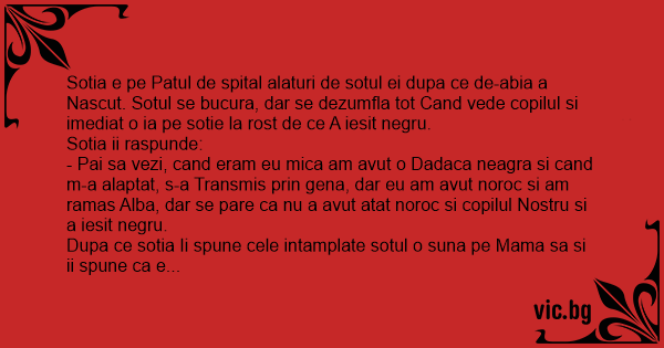 - Pai sa vezi, cand eram eu mica am avut o Dadaca neagra si cand m-a alaptat, s-a Transmis prin gena, dar eu am avut noroc si am ramas Alba, dar se pare ca nu a avut atat noroc si copilul Nostru si a iesit negru.