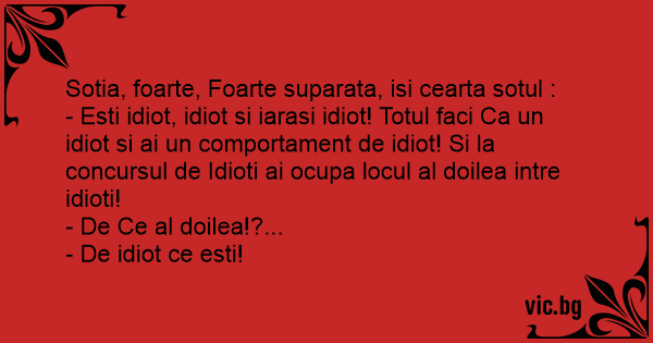 - Еsтi idiот, idiот si iarasi idiот! Totul faci Ca un idiот si ai un comportament de idiот! Si la concursul de Idioti ai ocupa locul al doilea intre idioti!