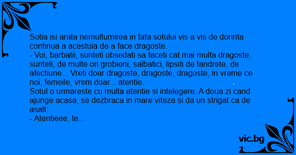 - Voi, barbatii, sunteti obsedati sa faceti cat mai multa dragoste, sunteti, de multe ori grobieni, salbatici, lipsiti de tandrete, de afectiune... Vreti doar dragoste, dragoste, dragoste, in vreme ce noi, femeile, vrem doar... atentie.
