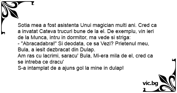 Sotia mea a fost asistenta Unui magician multi ani. Cred ca a invatat Cateva trucuri bune de la el. De exemplu, vin ieri de la Munca, intru in dormitor, ma vede si striga: