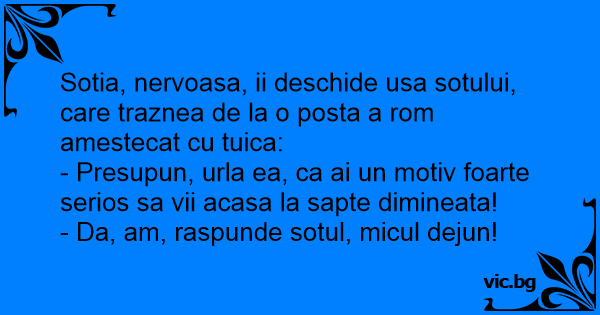 Soţul vine acasă pe la 6 dimineaţa. - Sper că ai motiv bun ca să vii la ora asta, zice soţia. - Da, am, ca să-mi beau cafeaua.