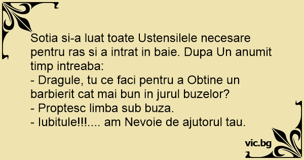 Sotia si-a luat toate Ustensilele necesare pentru ras si a intrat in baie. Dupa Un anumit timp intreaba: