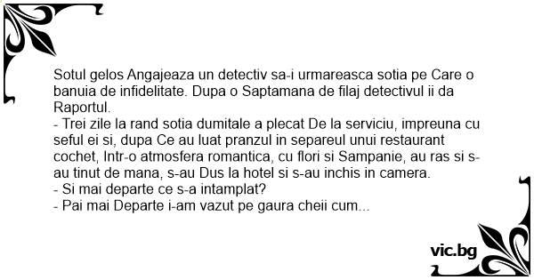 Sotul gelos Angajeaza un detectiv sa-i urmareasca sotia pe Care o banuia de infidelitate. Dupa o Saptamana de filaj detectivul ii da Raportul.