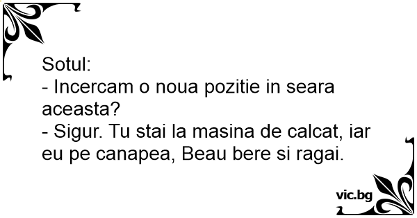 - Sigur. Tu stai la masina de calcat, iar eu pe canapea, Beau bere si ragai.