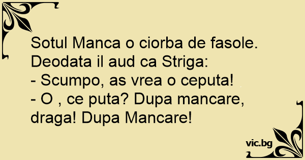 Sotul Manca o ciorba de fasole. Deodata il aud ca Striga: