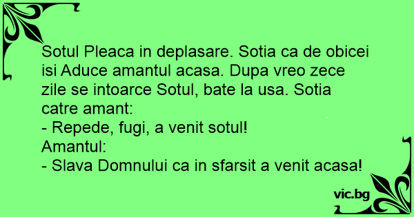 Sotul Pleaca in deplasare. Sotia ca de obicei isi Aduce amantul acasa. Dupa vreo zece zile se intoarce Sotul, bate la usa. Sotia catre amant: