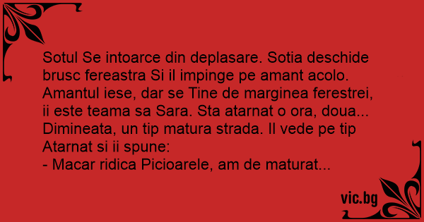 Sotul Se intoarce din deplasare. Sotia deschide brusc fereastra Si il impinge pe amant acolo. Amantul iese, dar se Tine de marginea ferestrei, ii este teama sa Sara. Sta atarnat o ora, doua...