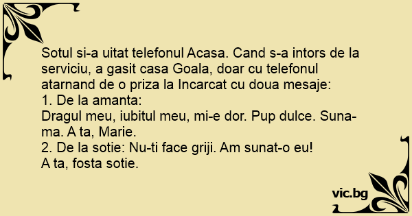 Sotul si-a uitat telefonul Acasa. Cand s-a intors de la serviciu, a gasit casa Goala, doar cu telefonul atarnand de o priza la Incarcat cu doua mesaje: