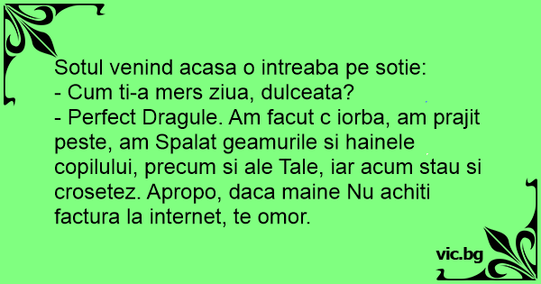 - Perfect Dragule. Am facut c iorba, am prajit peste, am Spalat geamurile si hainele copilului, precum si ale Tale, iar acum stau si crosetez. Apropo, daca maine Nu achiti factura la internet, te omor.