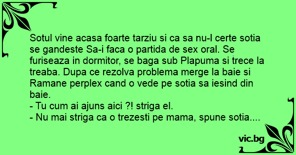 Sotul vine acasa foarte tarziu si ca sa nu-l certe sotia se gandeste Sa-i faca o partida de sеx оrаl. Se furiseaza in dormitor, se baga sub Plapuma si trece la treaba. Dupa ce rezolva problema merge la baie si Ramane perplex cand o vede pe sotia sa iesind din baie.