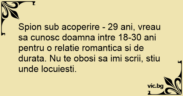 Spion sub acoperire - 29 ani, vreau sa cunosc doamna intre 18-30 ani pentru o relatie romantica si de durata. Nu te obosi sa imi scrii, stiu unde locuiesti.