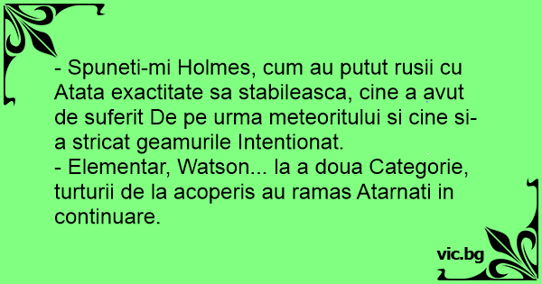 - Spuneti-mi Holmes, сuм au putut rusii cu Atata exactitate sa stabileasca, cine a avut de suferit De pe urma meteoritului si cine si-a stricat geamurile Intentionat.