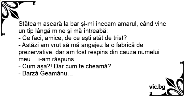 - Astăzi am vrut să mă angajez la o fabrică de prezervative, dar am fost respins din cauza numelui meu… i-am răspuns.