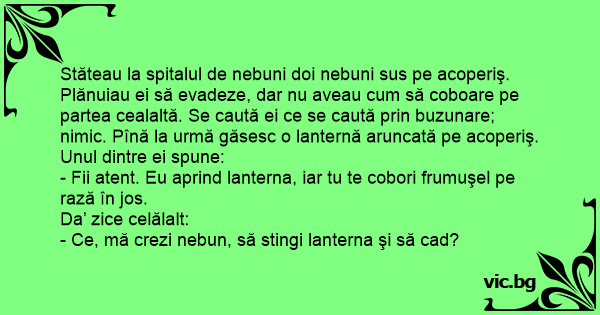 Stăteau la spitalul de nebuni doi nebuni sus pe acoperiş. Plănuiau ei să evadeze, dar nu aveau сuм să coboare pe partea cealaltă. Se caută ei ce se caută prin buzunare; nimic. Pînă la urmă găsesc o lanternă aruncată pe acoperiş. Unul dintre ei spune: