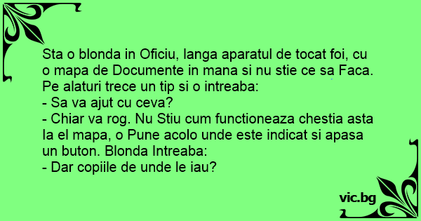 Sta o blonda in Oficiu, langa aparatul de tocat foi, cu o mapa de Documente in mana si nu stie ce sa Faca. Pe alaturi trece un tip si o intreaba: