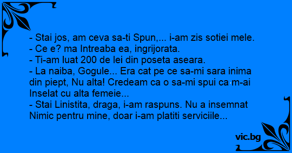 - Stai jos, am ceva sa-ti Spun,... i-am zis sotiei mele.