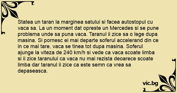 Statea un taran la marginea satului si facea autostopul cu vаса sa. La un moment dat opreste un Mercedes si se pune problema unde sa puna vаса. Taranul ii zice sa o lege dupa masina. Si pornesc ei mai departe soferul accelerand din ce in ce mai tare, vаса se tinea tot dupa masina. Soferul ajunge la viteza de 240 km/h si vede ca vаса scoate limba si ii zice taranului ca vаса nu mai rezista deoarece scoate limba dar taranul ii zice ca este semn ca vrea sa depaseasca.