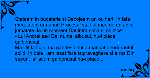 Stateam in bucatarie si Decojeam un ou fiert. In fata mea, atent urmarind Procesul sta fiul meu de un an si jumatate, la un moment Dat intra sotia si-mi zice: