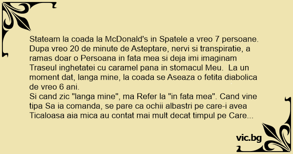 Stateam la coada la McDonald's in Spatele a vreo 7 persoane. Dupa vreo 20 de minute de Asteptare, nervi si transpiratie, a ramas doar o Persoana in fata mea si deja imi imaginam Traseul inghetatei cu caramel pana in stomacul Meu. La un moment dat, langa mine, la coada se Aseaza o fetita diabolica de vreo 6 ani.