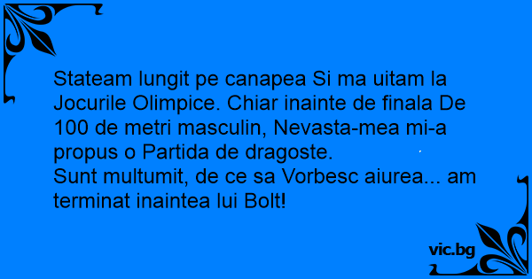 Stateam lungit pe canapea Si ma uitam la Jocurile Olimpice. Chiar inainte de finala De 100 de metri masculin, Nevasta-mea mi-a propus o Partida de dragoste.